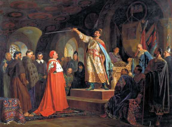 1204年,教皇英诺森三世派使节前往罗斯,以皈依罗马天主教为条件,答应为罗斯王公罗曼·姆斯季斯拉维奇加冕,但遭到拒绝(Nikolai Nevrev,1875年)[参见第46章]