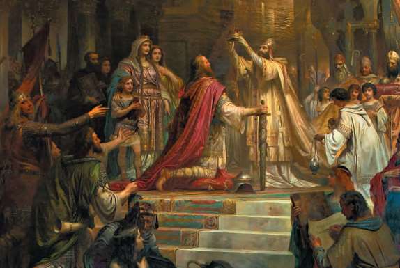 公元800年的圣诞节,教皇利奥三世为法兰克国王查理曼加冕,宣布他为“罗马人的皇帝”,但罗马帝国昔日的荣光并未再现(Friedrich Kaulbach,1861年)[参见第45章]