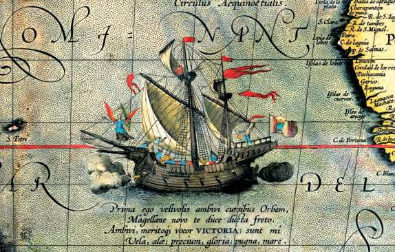 “维多利亚”号是唯一一艘在麦哲伦的环球航行中幸存的船只,选自第一部现代意义上的地图集《寰宇全图》中的一幅太平洋地图(Abraham Ortelius,1589年)[参见第49章]