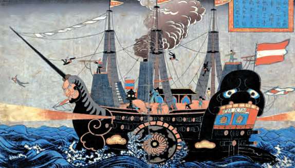 浮世绘作品中描绘的“黑船”(日本江户时代对来自欧美的蒸汽船的称呼)。1853年的“黑船来航”事件为日本浮世绘增添了一种新题材,即“开化绘”[参见第63章]