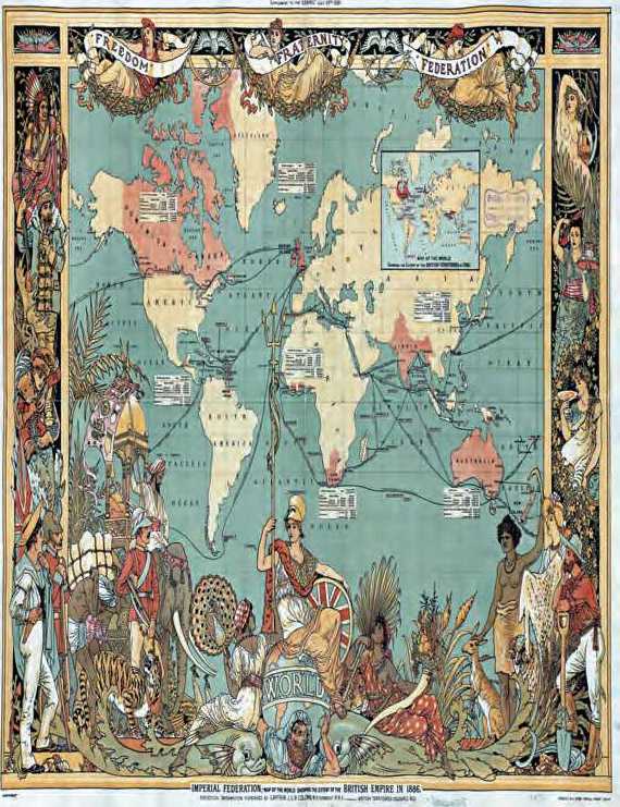 1886年的一幅大英帝国地图。维多利亚时代英国出版的世界地图习惯把大英帝国各领地和殖民地用粉色标出,以展现英国在全球范围内的霸权[参见第64章]