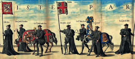 查理五世的葬礼上,仪仗举着撒丁王国的国旗。查理五世对葬礼极有兴趣,不仅喜欢参加他人的葬礼,甚至曾为自己举行过葬礼(Christophe Plantin,1559年)[参见第51章]