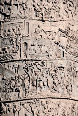 图拉真纪念柱浮雕(局部)。位于罗马图拉真广场,为纪念图拉真征服达西亚而建,柱身上环绕着长达200米的饰带浮雕,表现了罗马军队征战及凯旋的场景[参见第33章]