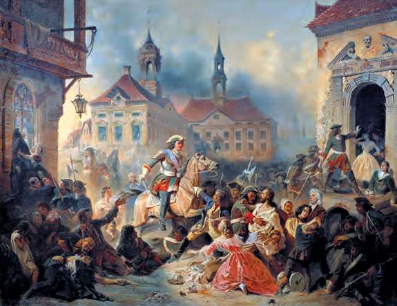 1704年,在夺取波罗的海门户纳尔瓦之后,彼得一世阻止士兵劫掠当地居民。在此前的大北方战争中,俄军曾在此被瑞典击败(Nikolay Sauerweid,1859年)[参见第52章]