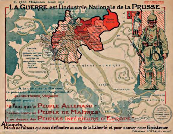 “战争就是普鲁士的国家产业。”第一次世界大战期间法国号召反抗普鲁士(即当时的德国)的宣传画,将其描绘成盘踞在欧洲地图上的一条章鱼(1917年)[参见第65章]