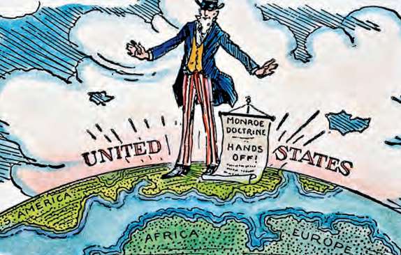 20世纪初表现门罗主义的美国漫画。1823年,美国总统门罗在国情咨文中提出,欧洲列强不应再插手美洲国家事务,但对拉美国家而言却成为一句虚假承诺[参见第56章]