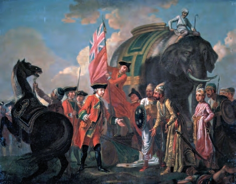 1757年的普拉西战役中,克莱武与莫卧儿帝国的孟加拉统治者米尔·贾法尔相互勾结,图为两人在战后会面(Francis Hayman,现藏于英国国家肖像艺术馆)[参见第53章]