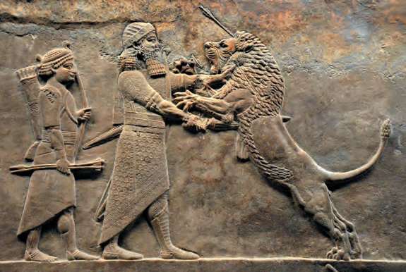 亚述帝国雄主亚述巴尼帕猎狮浮雕(现藏于大英博物馆)。猎狮是亚述的传统活动,国王每年都会亲自狩猎,以炫耀其武功,并命人将猎狮场面刻于墙上[参见第18章]