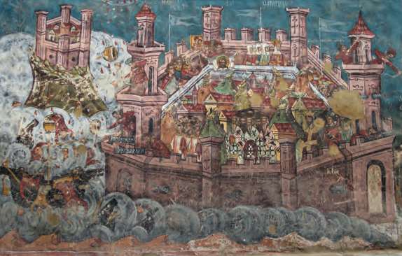 公元626年,萨珊波斯、阿瓦尔人和斯拉夫人联军围攻君士坦丁堡(罗马尼亚摩尔达维亚教堂壁画)。最终,这座以易守难攻而闻名于世的名城成功化险为夷[参见第41章]