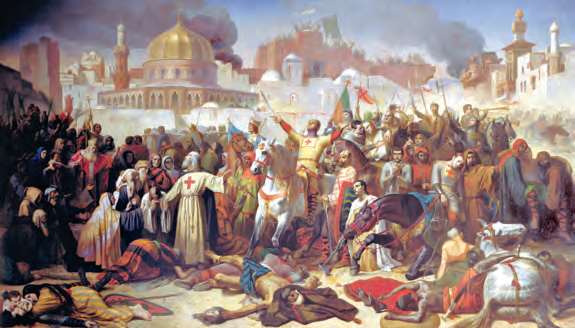 1099年7月15日,十字军经过一个多月的围攻,借助多种攻城器械,终于攻陷了耶路撒冷,这是这座“圣城”第一次被攻陷(Émile Signol,1847年)[参见第46章]
