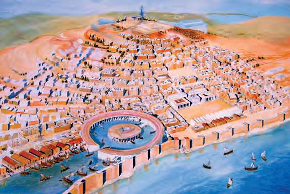 迦太基城复原图(现藏于突尼斯迦太基国家博物馆)。迦太基位于今突尼斯北部,起源于腓尼基人建立的殖民城邦,在布匿战争中败于罗马后被夷为平地[参见第17章]