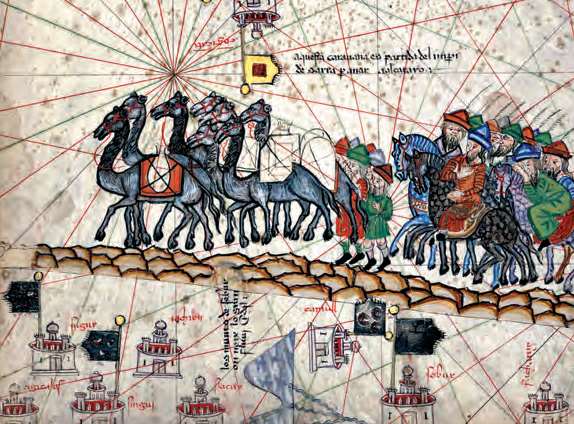 《加泰罗尼亚地图集》中描绘的丝绸之路上向东方行进的商队,绘图者参考了《马可·波罗游记》中的描述,将东方视作富庶之地(Abraham Cresques,1375年)[参见第49章]