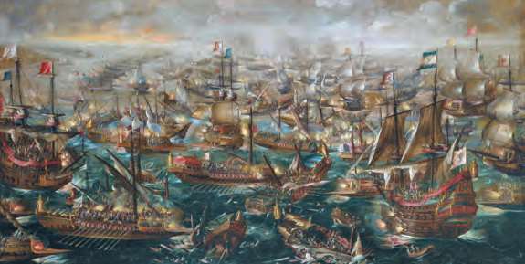 1571年,奥斯曼土耳其帝国海军向欧洲大举进攻,由西班牙、罗马教廷和威尼斯组成的联合舰队在勒班陀海角将其彻底击溃(Andries van Eertvelt,1640年)[参见第48章]