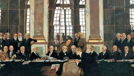 1919年6月28日,《凡尔赛条约》在凡尔赛宫镜厅签署,坐在长桌正中央的德国代表贝尔(Johannes Bell)正趴在桌上埋头签字(William Orpen,1919年)[参见第67章]