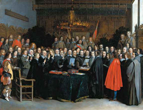 《威斯特伐利亚和约》开创了以国际会议解决国际争端的先例,确立了国家主权的原则,对近代国际法的发展具有重要的促进作用 (Gerard Terborch,1648年)[参见第52章]