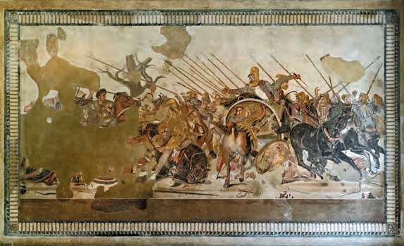 《伊苏斯之战》(马赛克镶嵌画,公元前1世纪,出土于意大利庞贝城)。公元前333年,亚历山大大帝在东征过程中,在伊苏斯大败波斯皇帝大流士三世[参见第26章]