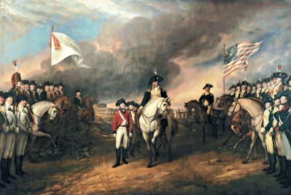 1781年,康华里将军在约克镇之战失败后投降。这是新成立的合众国政府邀请画家绘制的反映独立战争的爱国题材系列画作之一(John Trumbull,1817年)[参见第60章]
