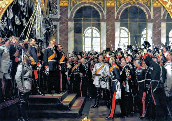 1871年1月,德意志帝国宣告成立,普鲁士国王威廉一世在法国凡尔赛宫加冕为帝国皇帝,德意志帝国一跃成为经济总量世界第二的强国(Anton von Werner)[参见第61章]