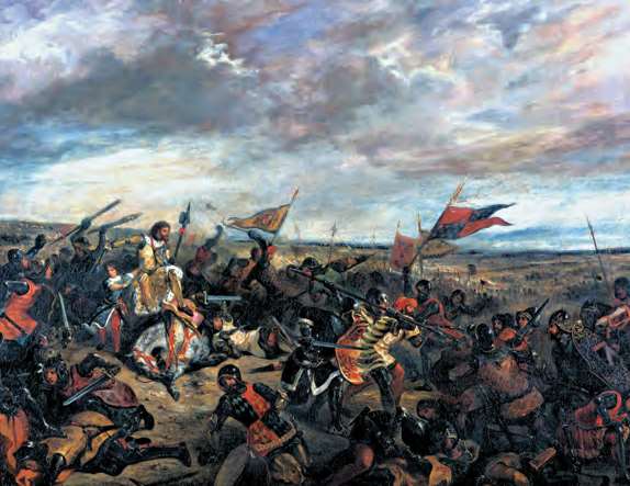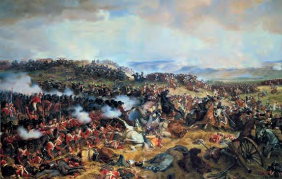 1815年的滑铁卢之战中,英军方阵迎战法军胸甲骑兵。拿破仑的最后一战以失败告终,也宣告了拿破仑帝国的终结(Henri F. E. Philippoteaux,1874年)[参见第55章]