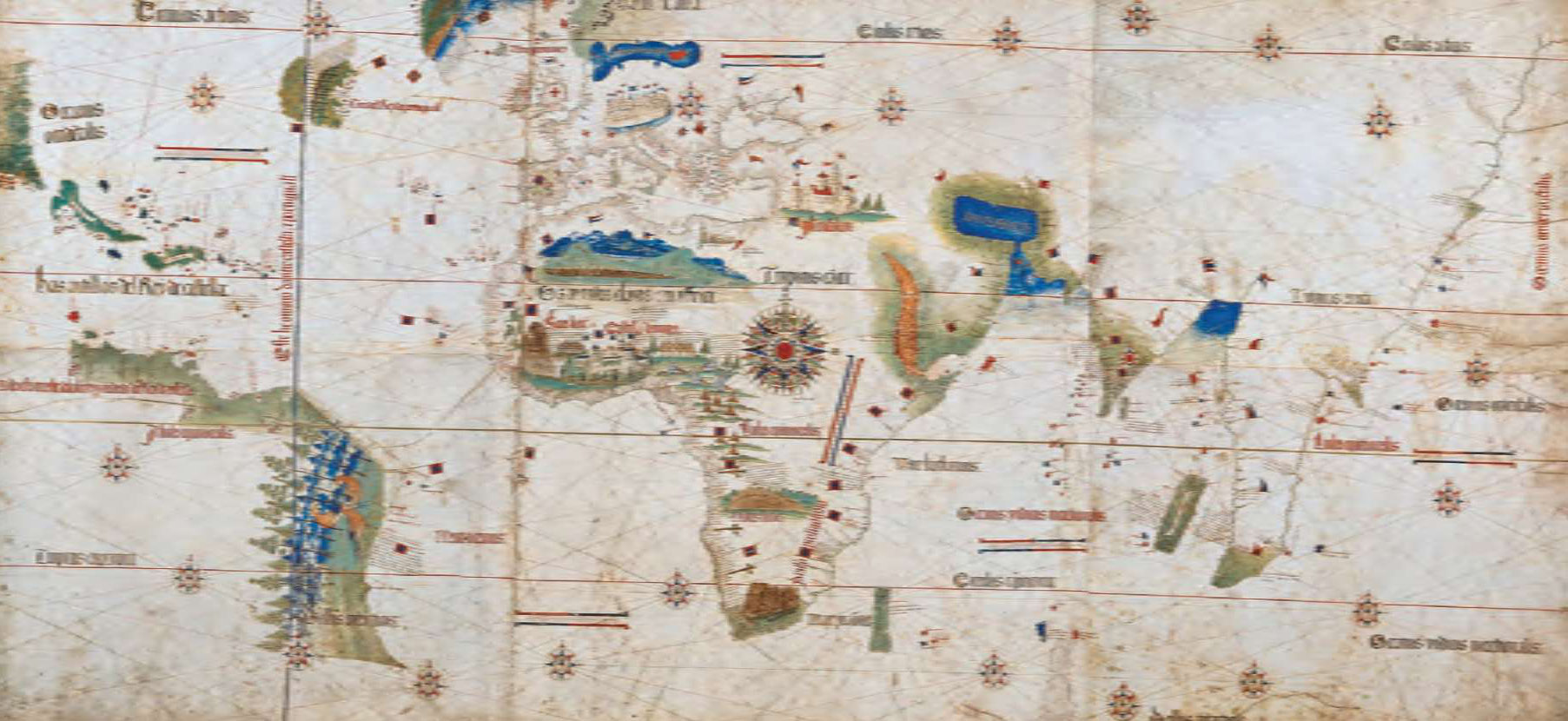 《坎帝诺世界航海图》(1502年)是现存的最早描绘“教皇子午线”的世界地图,也是最早反映大航海时代的先驱葡萄牙人向东西方探索的地图[参见第53章]