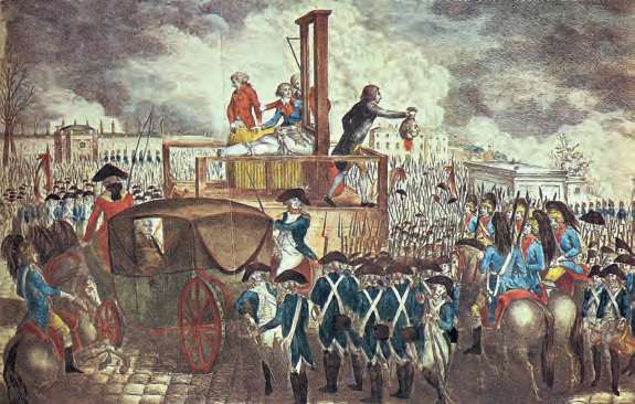 路易十六被送上断头台。路易十六喜爱机械,曾经改进断头台,最后却用到了自己身上,他也成为法国历史上唯一被处决的国王(Georg H. Sieveking,1793年)[参见第55章]