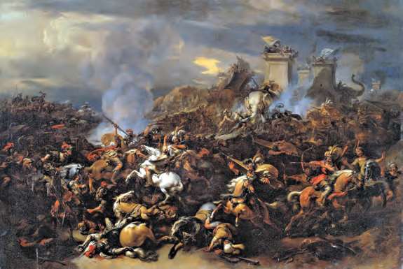 公元前326年,亚历山大大帝与印度君主波鲁斯在海达斯佩斯河会战中相遇,波鲁斯的象军令希腊士兵惊惧,但仍未能将其战胜(Nicolaes P. Berchem,17世纪)[参见第26章]