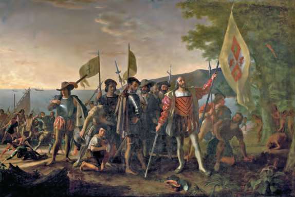 1492年,当哥伦布登上新大陆时,他兴奋地称之为“新世界”,但随即发现自己陷入了一场当地土著居民的争斗之中(John Vanderlyn,1842—1847年)[参见第49章]
