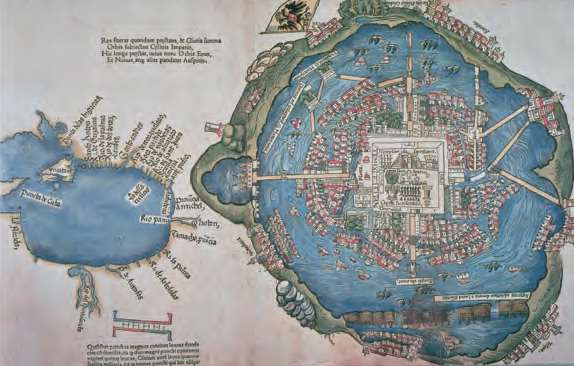阿兹特克帝国首都特诺奇提特兰地图(Friedrich Peypus,1524年)。1519年,西班牙殖民者科尔特斯率军征服并毁灭了这座岛上城市,今天仅存地下遗迹[参见第51章]
