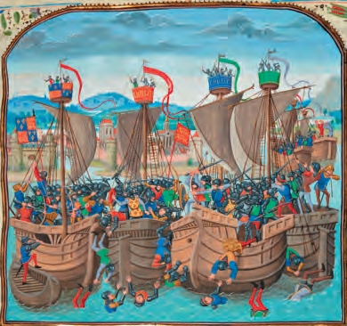1340年的斯鲁伊斯海战为英法百年战争揭开了序幕,法国舰队损失惨重,无法跨越英吉利海峡,因而后续战役大多发生在法国本土(JeanFroissart,15世纪)[参见第49章]
