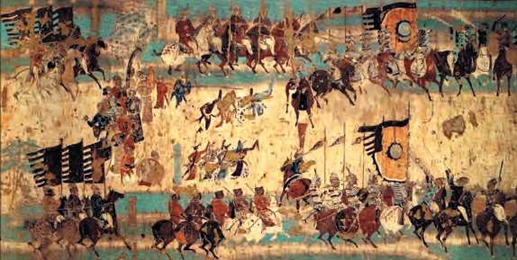 《张议潮出行图》。敦煌壁画的主题大多是佛教故事,现实题材较为少见,该图描绘了张议潮从吐蕃手中收复沦陷数十年之久的沙州,全军高唱《大阵乐》凯旋[参见第42章]