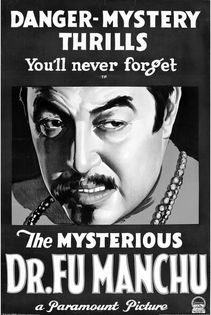 派拉蒙公司的有声电影《神秘的傅满洲》海报,1929年。电影讲述了傅满洲以收养的白人女孩莉亚·艾尔瑟姆为工具,杀掉在义和团运动中杀害自己妻儿的英国军人后代