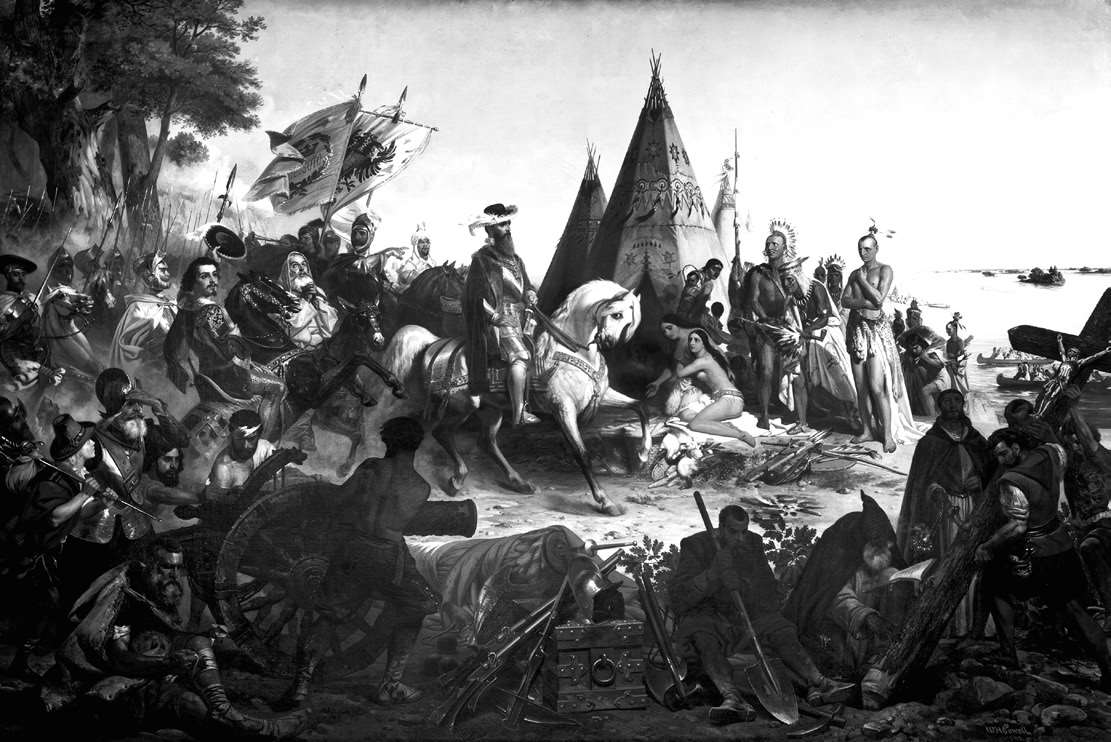 《发现密西西比》,威廉·亨利·鲍威尔(William Henry Powell, 1823—1879)所绘,描绘西班牙探险家德·索托(de Soto)第一次看到密西西比河的景象