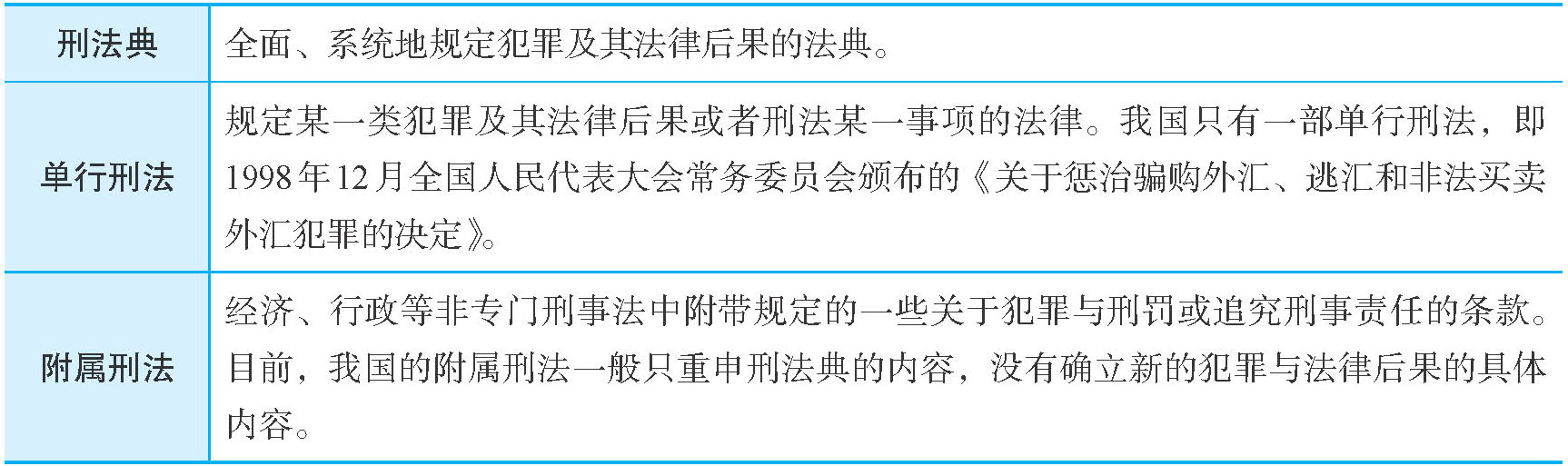 刑法是规定 犯罪及其法律后果 的法律规范的总和。在中国,刑法是由全国人民代表大会代表人民的意志制定的、规定犯罪及其法律后果的法律。我国刑法有以下几种存在形式: