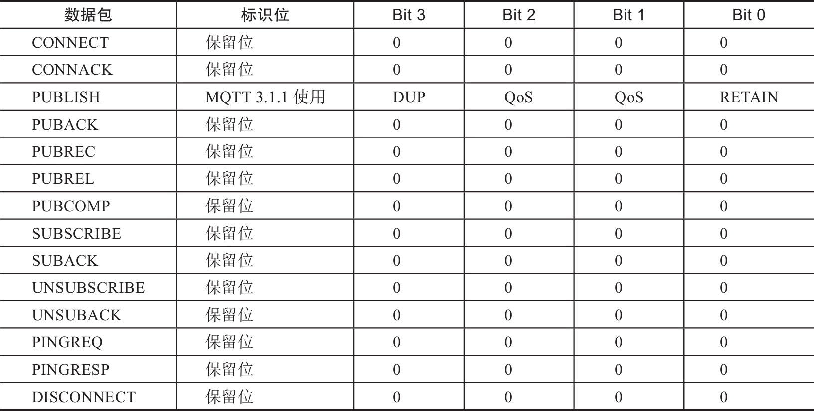 MQTT协议数据包的固定头的低4位用于指定数据包的标识位(Flag)。在不同类型的数据包中,标识位的定义是不一样的,每种数据包对应的标识位如表3-2所示。