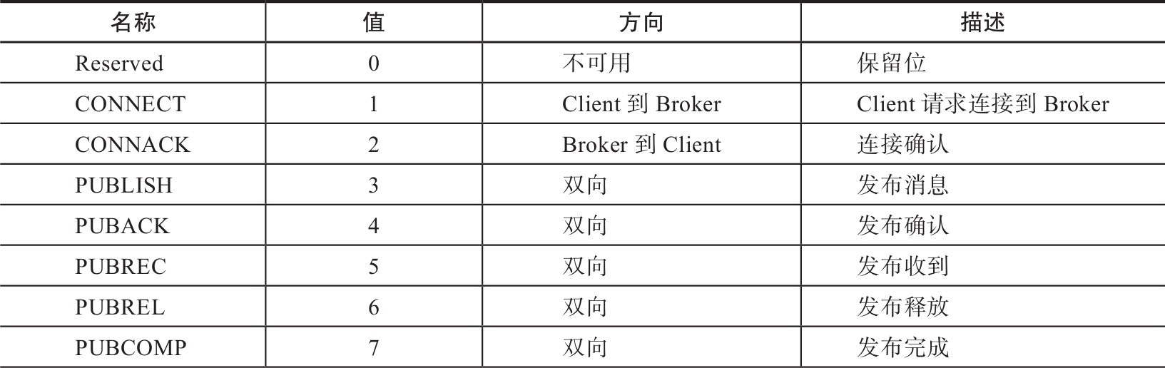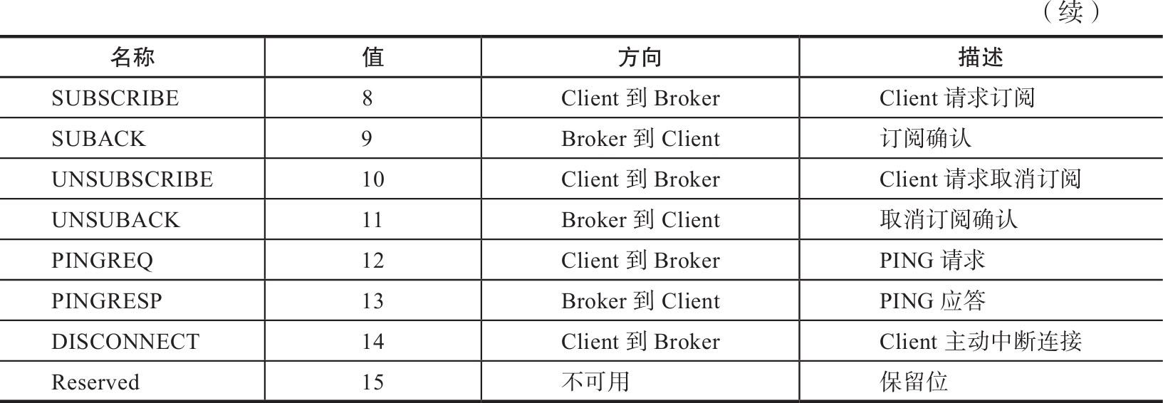 MQTT协议数据包的固定头的第一个字节的高4位用于指定该数据包的类型。MQTT协议的数据包类型如表3-1所示。