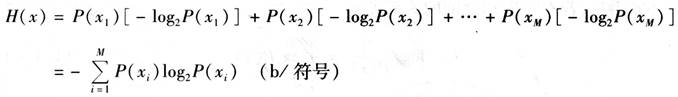 设离散信源是一个由M个符号组成的集合,其中每个符号x i (i=1,2,3,…,M)按一定的概率P(x i )独立出现。则平均信息量为