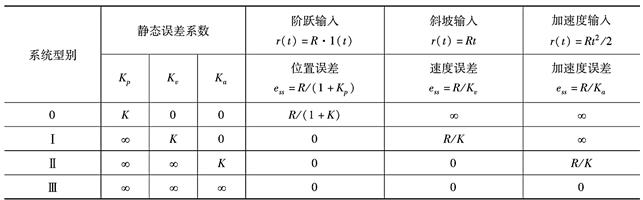 在阶跃信号、斜坡信号、加速度信号三种典型输入信号下,各型别系统的稳态误差如表3-1-4所示。