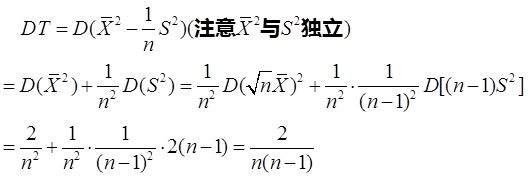 (Ⅱ)当μ=0,σ=1时, X ~N(0,1/n),即有n X 2 ~χ 2 (1),(n-1)S 2 ~χ 2 (n-1),而D(χ 2 (n))=2n。则