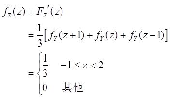 当-1≤z<2时,F Z (z)=P{Z≤z}=P{X+Y≤z}=P{X+Y≤z︱X=-1}P{X=-1}+P{X+Y≤z︱X=0}P{X=0}+P{X+Y≤z︱X=1}P{X=1}=[P{Y≤z+1}+P{Y≤z}+P{Y≤z-1}]/3=[F Y (z+1)+F Y (z)+F Y (z-1)]/3。
