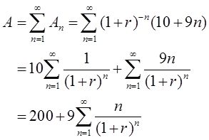 解: 设A n 为用于第n年提取(10+9n)万元的贴现值,则A n =(1+r) - n (10+9n),故