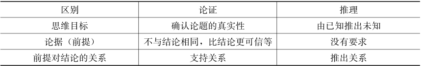 推理强调的是逻辑关系。论证除关注逻辑关系外,同时也关注论证的内容和主张。论证和推理的区别见表3-1。