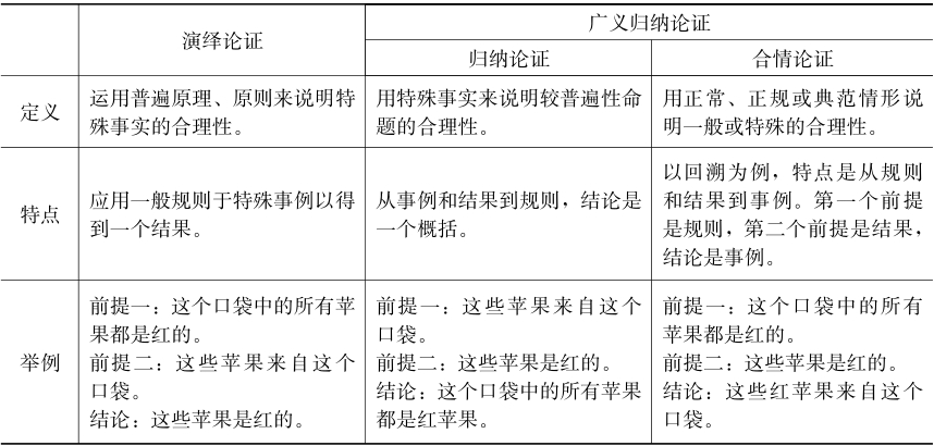 广义归纳论证包括归纳论证和合情论证。在经验科学和日常生活中,从自己和他人的经历中总结经验和教训(包括找因果关系)时,从个别经验上升到理论概括时,经常运用归纳论证;在个人生活中,根据某些不完全的信息作出推断或决策时,经常运用合情论证。论证的类型比较见表3-2。