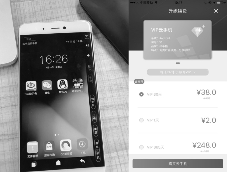 说起云模拟器(见图2.12),就不得不提红手指和河马云手机。在ARM主板上同时运行多个Android操作系统,然后通过远程控制工具实现近似于本机的用户操作,还可以实时分享给其他人观看。这种SaaS模式可以实现成本最小化。在平台租用一台模拟器,每天的平均成本不到1元。实际测试发现,模拟器上预装好了各种游戏外挂、改机工具,操作非常流畅,玩游戏没有任何卡顿。