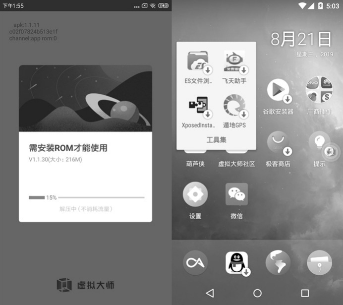 虚拟大师(基于Anbox)可以在Android设备上运行一个独立的Android模拟器,模拟器可以独立地运行各种Android APP。这个模拟器并非系统本身的镜像,由于apk打包了一个ROM(包含system.img和data.img),所以模拟器有自己独立的版本和各项属性。在Android手机上流畅运行模拟器,对于作弊者来说非常方便。值得一提的是,模拟器已经预装好了各种作弊工具和软件,如图2.14所示为虚拟大师的界面。有意思的是,红手指和虚拟大师的开发是姐妹公司。