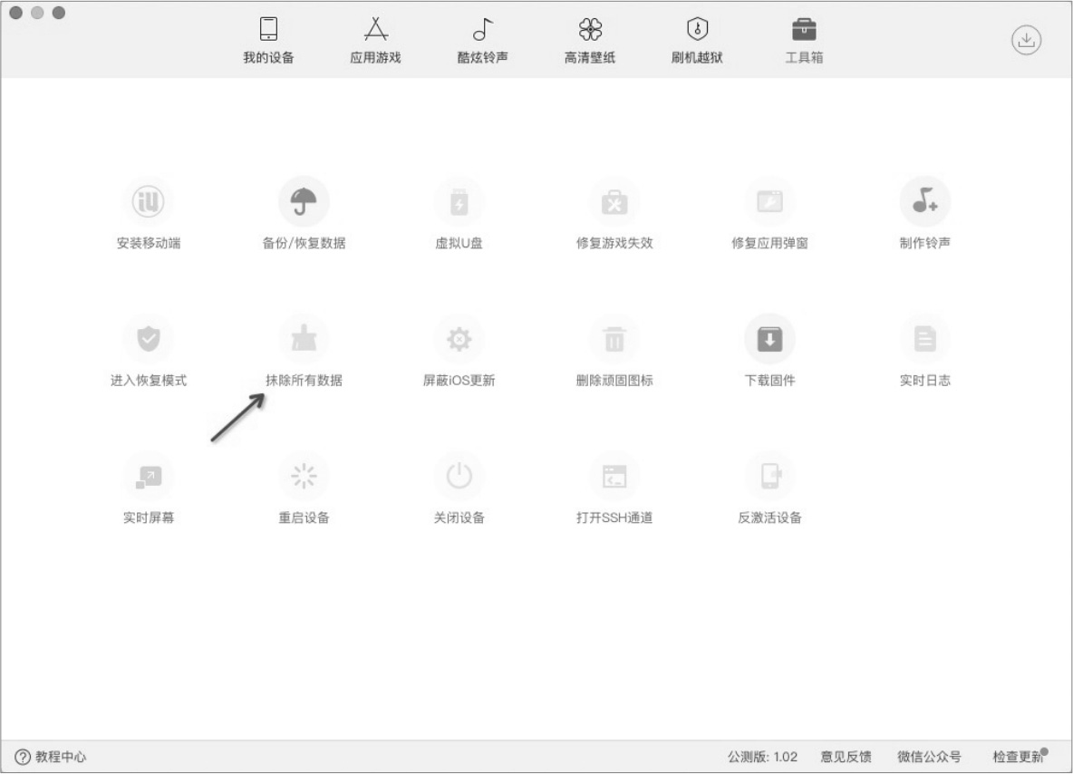 抹机恢复就是将设备完全重置,恢复成出厂设置,如图2.11所示。在这个过程中,用户的所有数据信息都会被清理,即抹机后就是一个理论上的新设备,经过测试使用某助手抹机的时间成本在3~5分钟,并且可以批量操作。