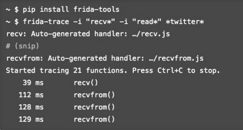 Frida是一款功能强大的轻量级hook框架,支持Android操作系统和iOS操作系统。它主要提供了功能简单的Python接口和功能丰富的JS接口,使得hook()函数和修改ELF等操作可以通过简单编程实现。Frida API接口包含了主控端与目标进程的交互接口,可以用于动态调试,即时获取信息并进行修改。使用Frida可以获取进程的信息(模块列表、线程列表、库导出函数),可以拦截指定函数和调用指定函数,可以注入代码,图2.8展示了使用Frida注入twitter并使用所有recv或read开头的函数,操作方便。如果你没有root手机或不想写hook代码,你也可以选择objection。objection是一个基于Frida开发的命令行工具,它可以很方便地hook Java函数和类,并输出参数,调用栈,返回值。