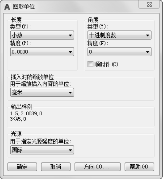 执行上述命令后,弹出“图形单位”对话框,如图1-32所示。该对话框用于定义单位和角度格式。
