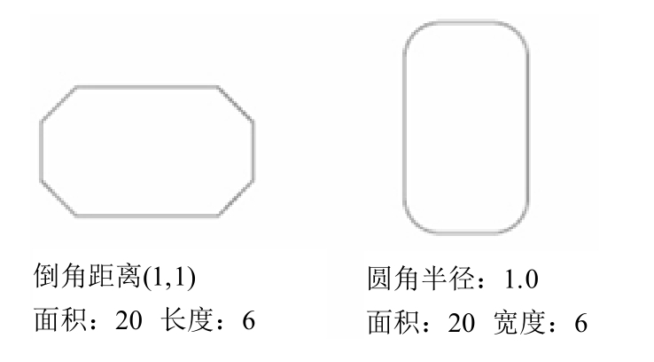 倒角(C):指定倒角距离,绘制带倒角的矩形,如图2-43(b)所示,每一个角点的逆时针和顺时针方向的倒角可以相同,也可以不同。其中,第一个倒角距离是指角点逆时针方向倒角距离,第二个倒角距离是指角点顺时针方向倒角距离。