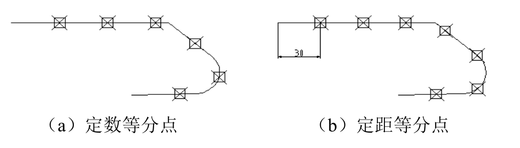 命令: MEASURE↙ 选择要定距等分的对象:(选择要设置测量点的实体) 指定线段长度或 [块(B)]:(指定分段长度,绘制结果如图2-54(b)所示)