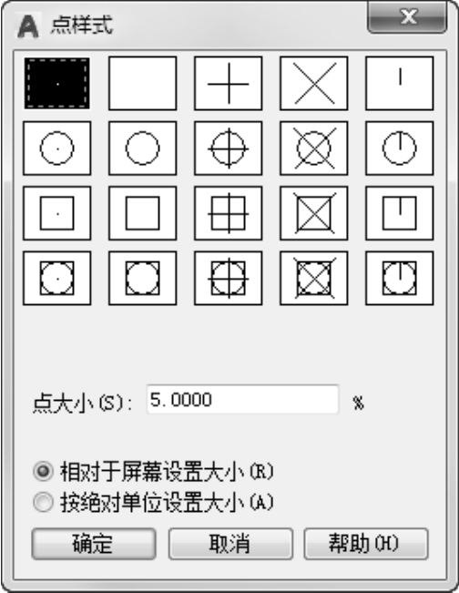 (3)点在图形中的表示样式共有20种。可选择菜单栏中的“格式”→“点样式”命令,在打开的“点样式”对话框中进行设置,如图2-53所示。